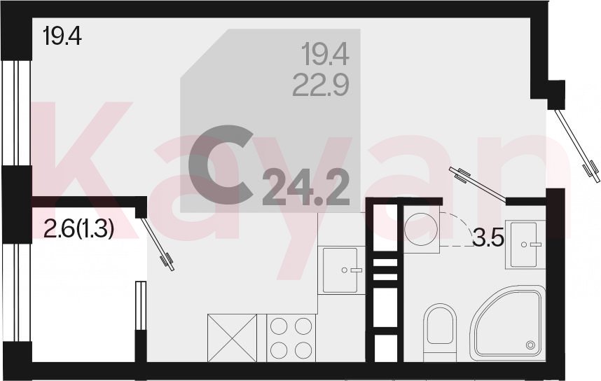 Квартира в ЖК «Первое место» (ГК Точно. Краснодарский край) литер 1.3. Л2 очередь 1, Монолитный, студия, 22.9 кв.м., 10/18, высота потолков: 2.66 м, жилая площадь: 19.4 кв.м., возможна ипотека, возможна военная ипотека, площадь кухни 0 кв.м.,