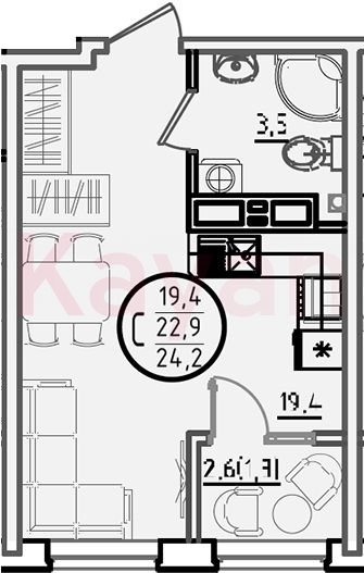 Квартира в ЖК «Первое место» (ГК Точно. Краснодарский край) литер 1.2 Л2 очередь 1, Монолитный, студия, 22.9 кв.м., 9/18, высота потолков: 2.66 м, жилая площадь: 19.4 кв.м., возможна ипотека, возможна военная ипотека, площадь кухни 0 кв.м.,