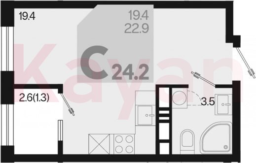 Квартира в ЖК «Первое место» (ГК Точно. Краснодарский край) литер 1.5 Л1 очередь 1, Монолитный, студия, 22.9 кв.м., 12/18, высота потолков: 2.66 м, жилая площадь: 19.4 кв.м., возможна ипотека, возможна военная ипотека, площадь кухни 0 кв.м.,