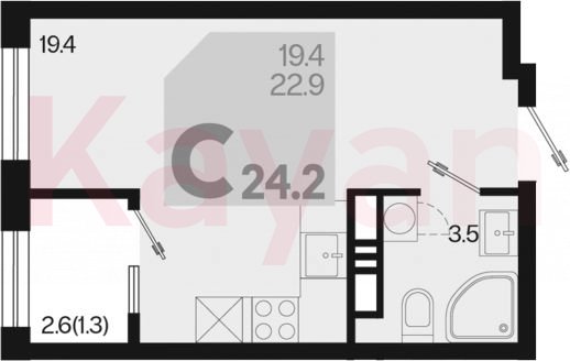 Квартира в ЖК «Первое место» (ГК Точно. Краснодарский край) литер 1.5 Л1 очередь 1, Монолитный, студия, 22.9 кв.м., 17/18, высота потолков: 2.66 м, жилая площадь: 19.4 кв.м., возможна ипотека, возможна военная ипотека, площадь кухни 0 кв.м.,