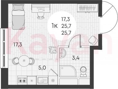 Квартира в ЖК «Green Apple» (БЭЛ-Девелопмент) литер 1 очередь 1, Кирпично-монолитный, студия, 25.7 кв.м., 13/16, высота потолков: 2.8 м, жилая площадь: 22.3 кв.м., возможна ипотека, площадь кухни 0 кв.м.,