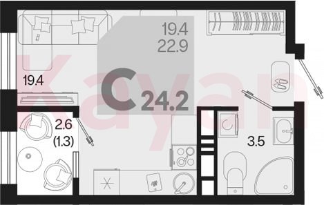 Квартира в ЖК «Первое место» (ГК Точно. Краснодарский край) литер 1.6 Л1 очередь 1, Монолитный, студия, 22.9 кв.м., 10/18, высота потолков: 2.66 м, жилая площадь: 19.4 кв.м., возможна ипотека, возможна военная ипотека, площадь кухни 0 кв.м.,