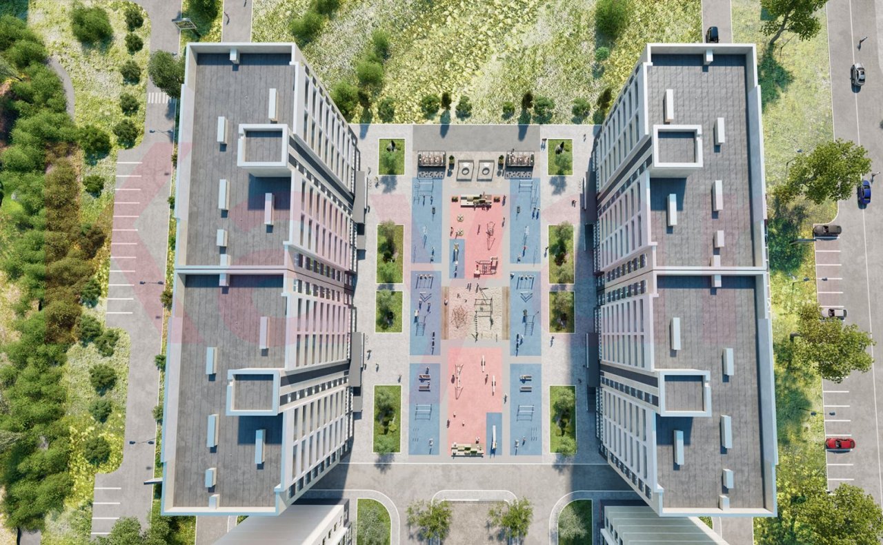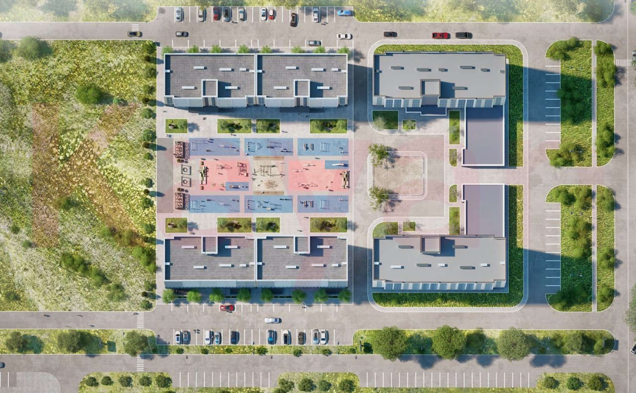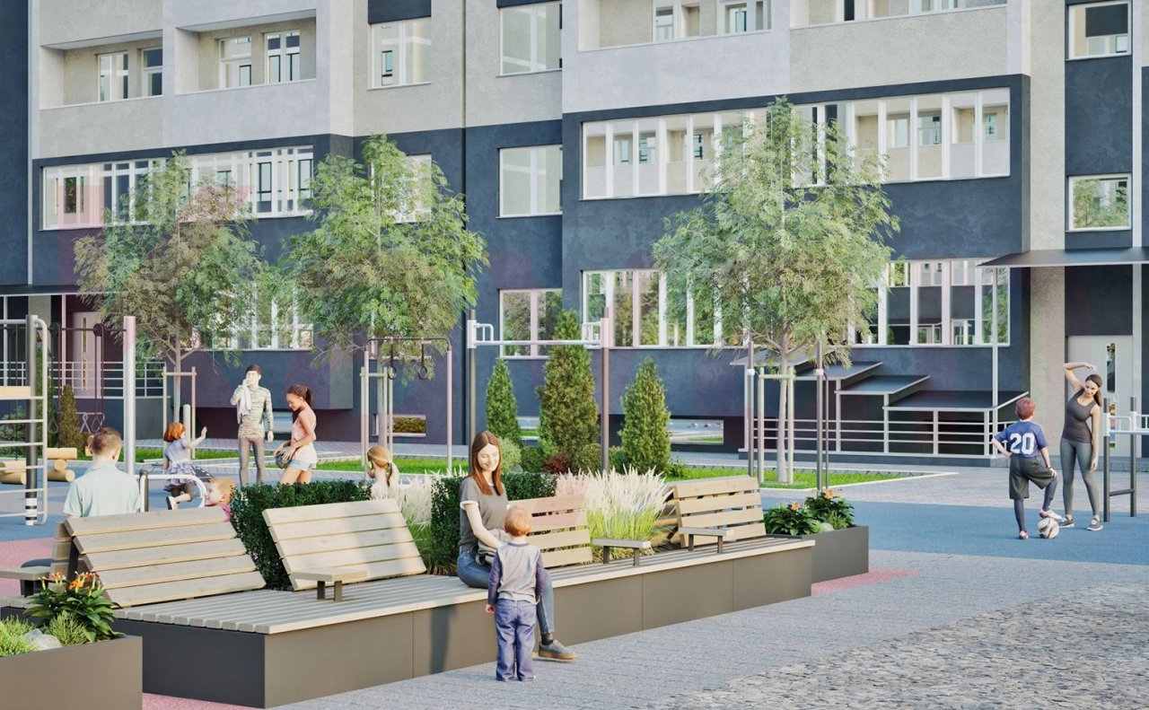 Территория комплекса благоустроена: выполнено ландшафтное озеленение, спроектированы детские и спортивные площадки, места для отдыха. Для владельцев автомобилей предусмотрена стоянка.