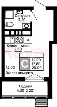 Квартира в ЖК «Традиции» (ССК. Краснодарский край) литер 1 очередь 1, Монолитный, студия, 17.8 кв.м., 7/16, высота потолков: 2.72 м, жилая площадь: 14.6 кв.м., возможна ипотека, площадь кухни 0 кв.м.,