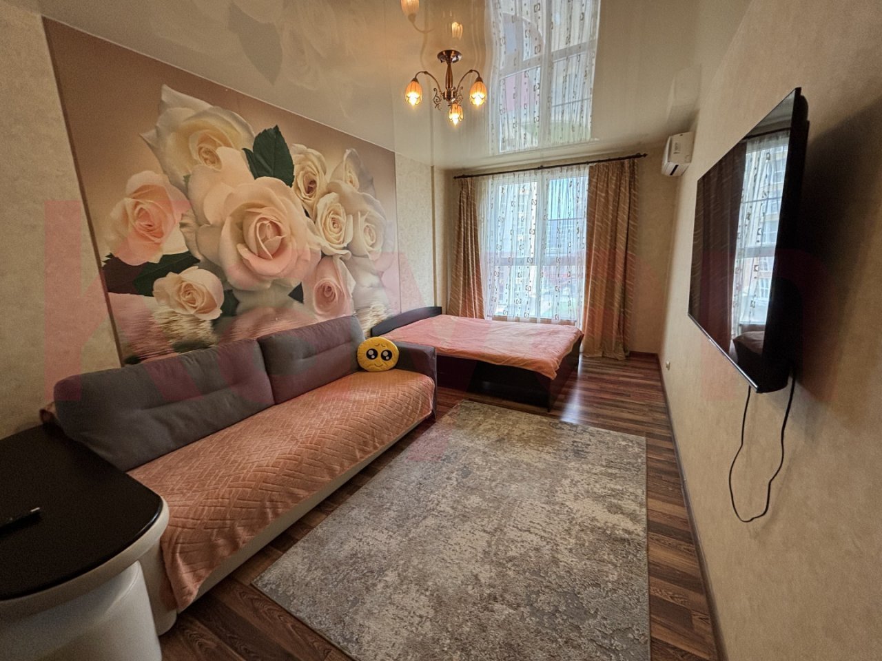 Квартира с современным ремонтом, имеются теплые полы; есть гардеробная комната, вся мебель, спальные места: раскладной диван-кровать и двуспальная кровать с матрасом, из бытовой техники: сплит-система, стиральная машина-автомат, 2-х камерный холодильник, 2 телевизора, СВЧ-печь, электрочайник, утюг, гладильная доска, сушилка для белья, проведен скоростной интернет.